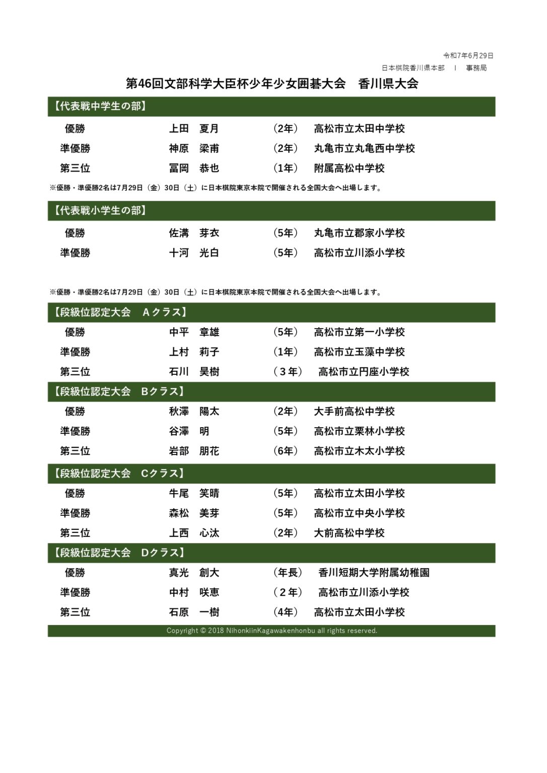 6月29日 第46回文部科学大臣杯少年少女囲碁大会香川県大会